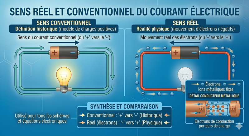 Les électrons se déplacent réellement de la borne négative vers la borne positive. Pourtant, par convention, le courant est représenté dans le sens opposé, de la borne positive vers la borne négative. Cette convention est encore utilisée dans tous les schémas électriques et électroniques.